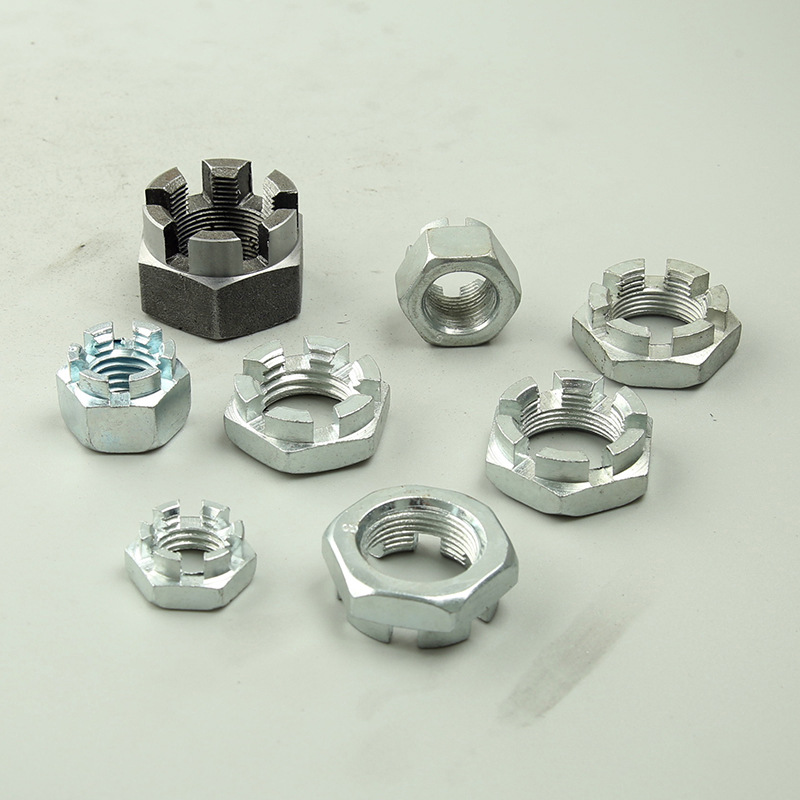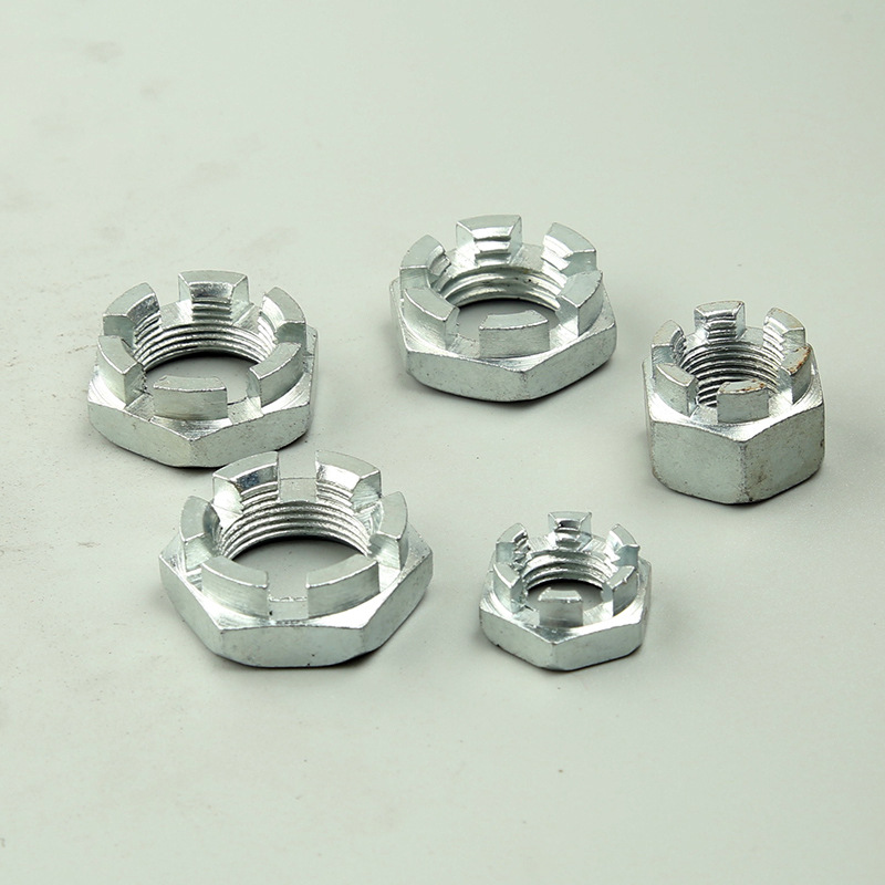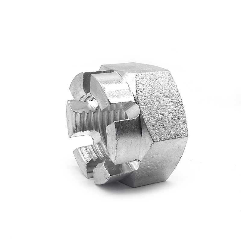 ப: ஸ்லாட்டுடன் இரட்டை பாதுகாக்கப்பட்ட கிரீடம் நட்டின் முக்கிய வேலை என்னவென்றால், ஒரு திரிக்கப்பட்ட போல்ட் அல்லது ஸ்டட் மீது இறுக்கமாக பூட்டப்படுவது - எனவே அதிர்வு இருக்கும்போது அது தளர்வாக வராது. அந்த கிரீடம் (அல்லது காஸ்டெலேட்டட், சிறிய குறிப்புகள் போல) வடிவமைப்பைக் கொண்டுள்ளது, இது ஒரு கோட்டர் முள் அல்லது பாதுகாப்பு கம்பியை ஸ்லாட்டுகள் வழியாக சறுக்கி, போல்ட்டில் ஒரு துளை ஆகியவற்றைக் கொண்டுள்ளது. இது நழுவாத ஒரு திடமான இயந்திர பூட்டை உருவாக்குகிறது.