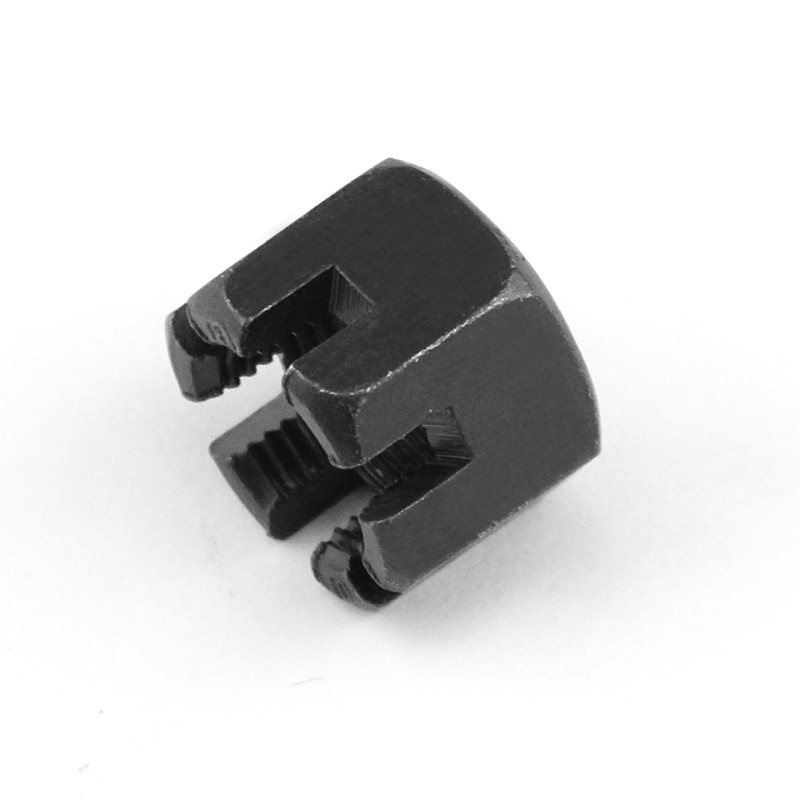| முக்கிய அம்சம் | மேலே உள்ள இந்த ஸ்லாட்டுகள் லாக்கிங் பின்கள் அல்லது பாதுகாப்புக் கயிறுகளை வைக்கப் பயன்படுகிறது. நீங்கள் நட்டை இறுக்கியவுடன், இந்த ஸ்லாட்டுகள் மற்றும் போல்ட்டில் உள்ள துளைகள் வழியாக முள் அனுப்பவும். இது அதை சரியான இடத்தில் சரிசெய்யும் (வலுவான அதிர்வுகளுடன் கூட, நட்டு தளர்ந்துவிடாது). இது ஒரு எளிய இயந்திர பூட்டு. |